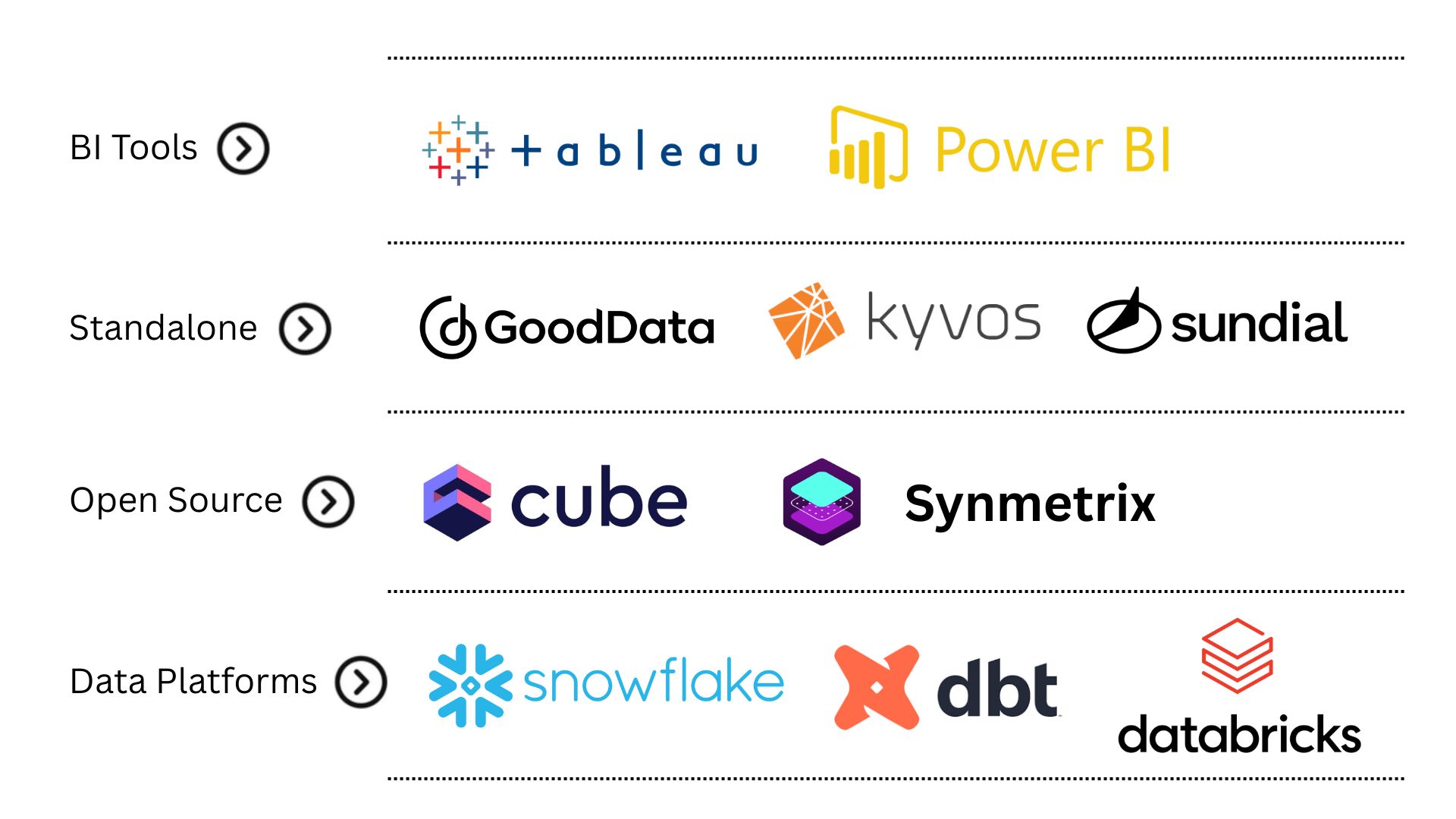 Good thing for us is that many companies have realized the value of Semantic layers in the era of AI and have already built (or are starting to build) these functionalities on various levels of the data stack. As a good rule of thumb, it should definitely NOT be tightly coupled with your BI tool. So it has to sit somewhere in between your data platform (physical model) and your end consumer (AI / BI)